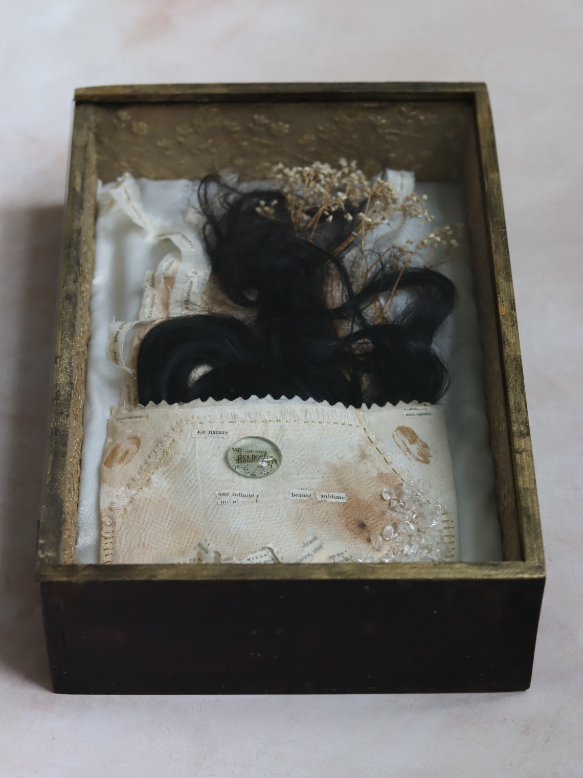Wooden box with human hair in textile envelope, white silk, poems from antique book pages on ribbon, glass beads, dried flowers